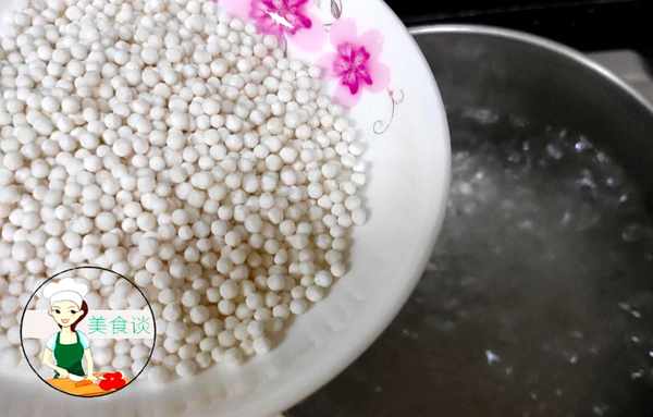 2、趁著煮紅豆的功夫我們來煮西米。鍋裏加入適量的清水,大火將水煮沸,加入西米下鍋煮。