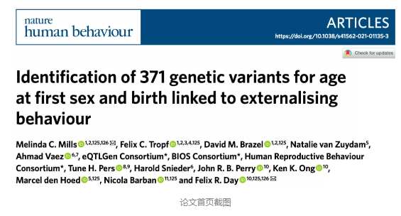[1]《《自然》子刊:首次性行為和生育年齡寫在基因裏了?劍橋和牛津團隊找到了371個相關遺傳位點,且發現晚育與壽命更長有關》.奇點網. 2021-08-07