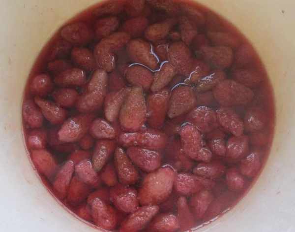 第三步:草莓清洗乾淨以後,撈到微波爐桶裏,加入適量的白糖和檸檬汁,用米飯鍵蒸熟,一滴水也不用放,草莓熟透後會出來很多的水。