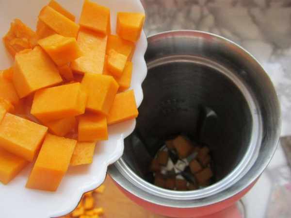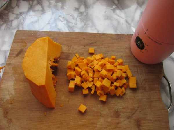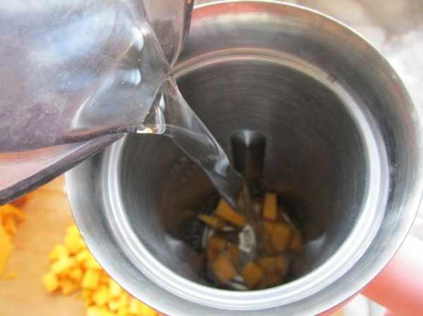 把臻米迷你破壁機清洗乾淨,倒入南瓜丁,這款迷你破壁機採用304食品級不銹鋼內膽,不用擔心健康問題。