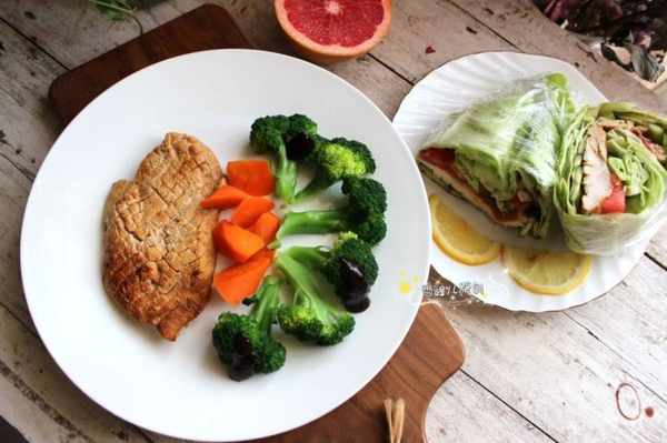 甘藍包做法:甘藍菜洗淨鋪到保鮮膜上,放上熟雞胸肉和蕃茄片,擠上無油沙拉醬,收緊保鮮膜包成一個圓形,用刀切開即可。烤雞胸肉:雞胸肉改刀,撒上胡椒粉,生抽,鹽,拌勻醃漬。烤箱200度烤制10分鐘熟透拿出即成。西蘭花胡蘿蔔焯水即可。吃完了以後再吃一半西柚,减脂效果更好。
