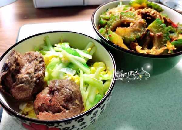 苦瓜炒蛋做法:苦瓜洗淨去籽,切成片,不粘鍋裏放上雞蛋炒成塊,加入辣醬炒勻,倒入苦瓜煸炒,稍微淋一點水防止糊鍋,炒熟後出鍋即成。韭黃雞蛋做法:韭黃切段,雞蛋炒成塊,倒入韭黃煸炒均勻,撒適量的鹽調味即成。純正的牛肉丸子用水充分煮熟就可以吃了。