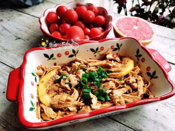 檸檬雞絲做法:雞胸肉煮熟,用手撕成小塊,加入生抽,鹽,檸檬片,辣椒粉,蚝油拌勻,撒上小葱末即成,配上半碗聖女果和半個西柚。