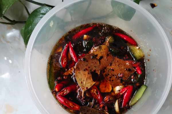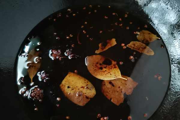 5.鍋內加入油燒熱,下入薑片,花椒,八角,香葉炸香,淋入醬油,把醬油燒開,關火,再加入白糖攪拌均勻,把湯汁晾凉。