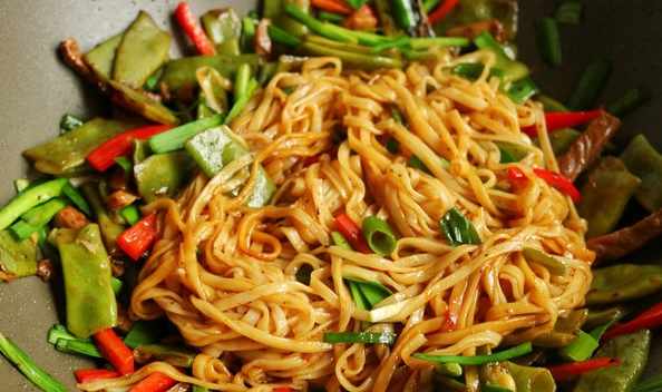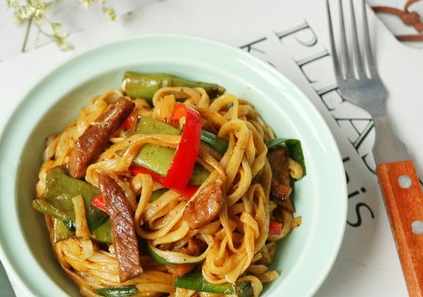空心面100克、牛肉150克、扁豆200毫升、韭菜30克、紅椒1個、小葱1棵、薑2克、花生油15毫升、精鹽2克、五香粉1小勺、蚝油1勺、生抽15毫升、醬油10毫升