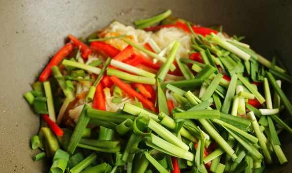9.把韭菜段和紅椒絲鋪在上面,再燜半分鐘。