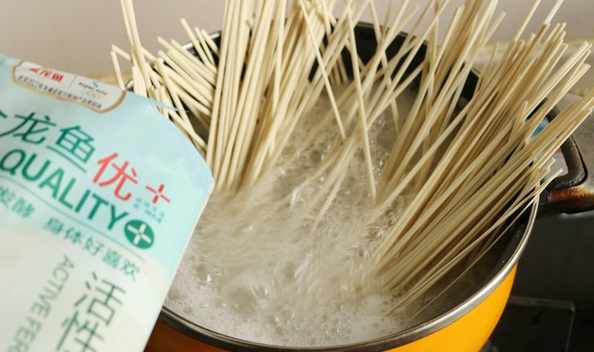 4.湯鍋加水燒開,下入掛麵,煮至麵條變軟即可,不需要煮熟。
