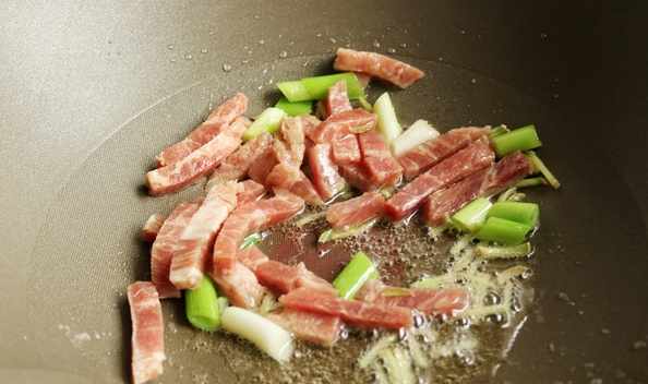 6.炒鍋加入花生油,燒熱後放入葱薑爆香,再放入牛肉條滑炒。