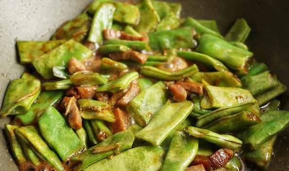 7.再放入扁豆段,加入調料炒勻,加入適量水,整理一下使食材平鋪在底部,水不要超過菜。