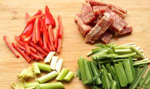 2.牛肉切成條,紅椒切粗絲,葱薑切絲,韭菜切段。切好的牛肉加入少許水澱粉、鹽和油醃制一會。