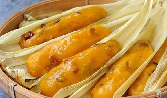 做法:南瓜蒸熟,壓成泥後加入所有的粉類和紅棗碎、糖,拌成麵團。將麵團分成小劑子,放在手中團成長條狀,放在玉米葉子中,蒸15分鐘即可,加入了糯米粉的玉米糕,柔軟清爽特別好吃呢。