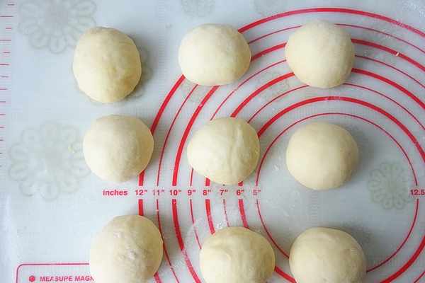 6、把發酵好的麵團取出來排氣後分割成9個小劑子,簡單滾圓。其實大小隨意,我做了9個,正好是一烤盤。