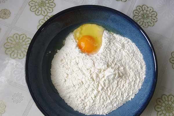 1、麵粉備好,打入一個雞蛋,我做的這些量能做小碗口大小的餅9個。