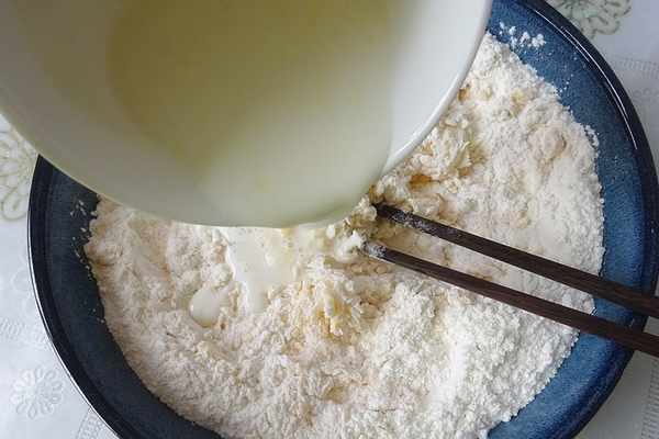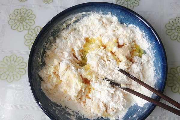 3、牛奶雞蛋把麵粉攪拌成大絮狀,然後放入食用油,在簡單拌一拌,用手和麵。我做了豆沙餡,豆沙餡是甜口的,所以,麵團裏沒有放糖,如果不放餡,可以在這一步裏適當放點白糖。