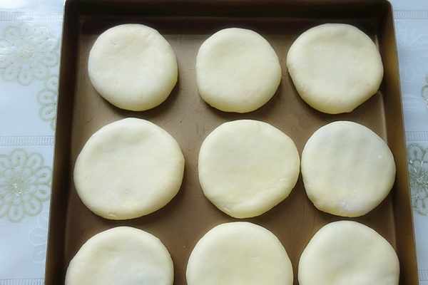 9、包餡收口的麵團在擀成1釐米厚的小餅,擺放在烤盤裏。