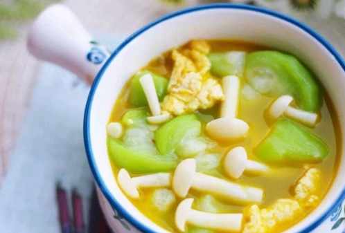 食材:絲瓜、雞蛋、葱、海鮮菇、鹽、雞精、枸杞
