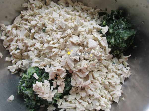 第四步:把剁碎的掃帚菜放入盆裏,再放入切碎的豆腐末,小葱末。
