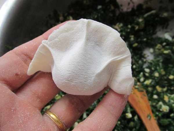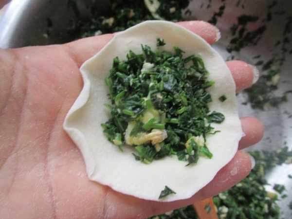 第六步:拿一個餃子皮,包上餡料,餡料不要太多,因為焯過水的蔬菜不會再萎縮,也就是我們常說的很出餡,餡太多了反而不好吃。