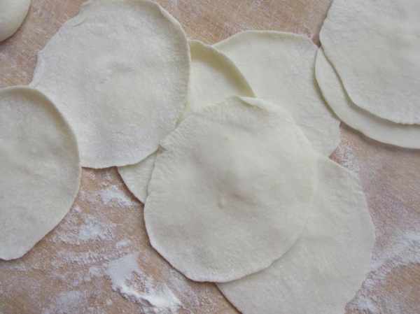 第五步:麵粉加入水提前和好麵團,靜置一會揉勻揉光,搓成長條,揪成大小一致的小劑子,擀成薄一些的餃子皮。