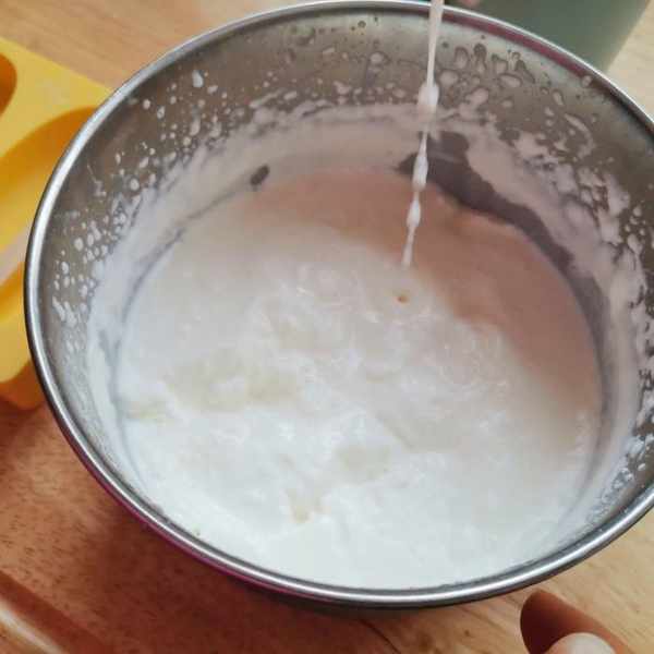 第一步:把動物性淡忌廉放入白糖打發到濃稠的狀態,倒入牛奶,繼續用打蛋器攪打均勻。