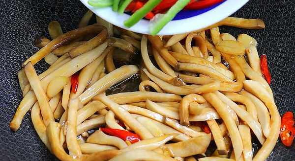 4、接著把杏鮑菇放進裡面,加入生抽,鹽,蚝油,快速的翻拌均勻,使調料的香味,和薑、蒜、辣椒的香味都滲入到杏鮑菇的裡面。