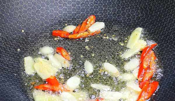3、提前準備一把大蒜,剝皮之後,切成蒜片,兩根小米辣,斜刀切成小段,一小塊的生薑切成薑片,接著鍋中燒油,油熱之後把這些食材放進鍋中,用大火爆出香味。
