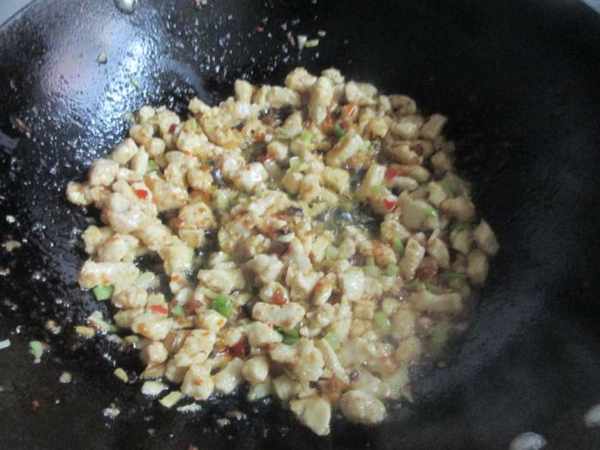 第四步:倒入雞胸肉滑炒到發白,然後再加入葱末薑末炒勻,然後倒入海鮮醬。
