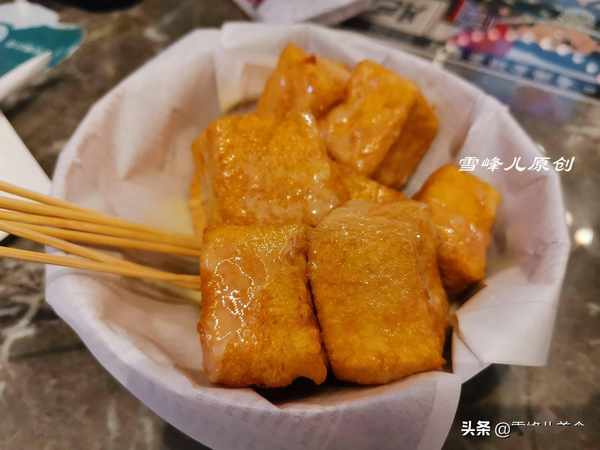 西多士,西多士其實就是麵包塊,表面炸黃,澆上煉乳,值得時候蘸食,用竹簽插著,表面看起來很像臭豆腐的感覺,但是味道和口感都很棒。