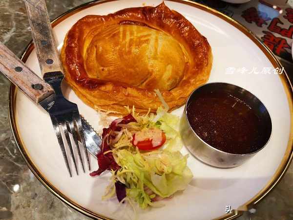 著重說一下這一款惠靈頓牛排,點的茶點都上了,這款牛排是最後上來的,稍微慢一點,合照上沒有排上,但不代表咱沒吃。惠靈頓牛排估計大家不陌生,關於惠靈頓牛排的說法是:把英國惠靈頓公爵愛吃的,牛菲力、鹅肝、松露等食材,用酥皮包起來烘焙成了惠靈頓牛排。現在經過了各種地方的改進,形成的簡單好吃的一款惠靈頓牛排。