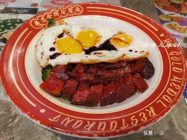 它叫招牌黯然銷魂飯,其實就是叉燒飯,是廣東的一種特色飯,底下是米飯,上面是叉燒和太陽蛋,配上幾根芥蘭,吃得時候攪拌均勻,叉燒吃到嘴裡微甜微鹹,口感和味道都特別好,肥而不膩,比紅燒肉都好吃。