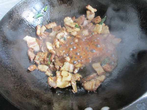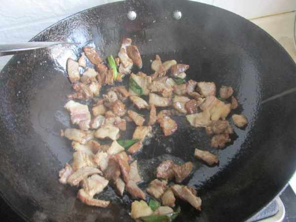 第二步:鍋裏放入花生油,入葱薑爆香,倒入肉片煸炒。