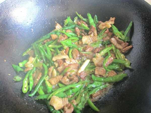 第四步:倒入切好的辣椒繼續煸炒,稍微烹一點水,加鹽調味,別炒糊了。