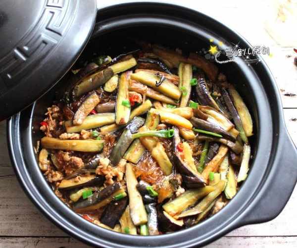 茄子煲做法:1,長茄洗淨切長條備用,平鍋放入花生油少許,把茄子條放入煎制道發軟。2,幹燒砂鍋,放少許油,入葱,薑,小米椒炒香,倒入肉末煸炒到肉末發白,加入半勺醬油醬油,一勺蚝油煸炒均勻。3,倒入少許水,加少許鹽和白糖半勺調味,把泡好的粉絲放入。4,把煎好的茄子均勻的放在粉絲上面,大火燒開,改成小火慢燉2分鐘,讓茄子充分入味,吸收湯汁裏的鮮美味道,然後撒上小葱末和小米椒圈點綴即成。