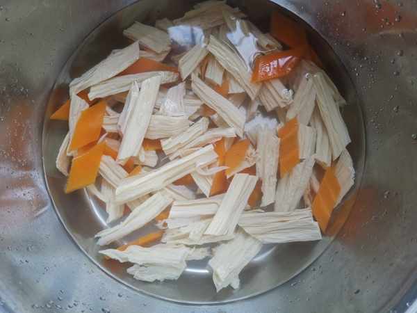 第三步:把腐竹和胡蘿蔔片放到開水中焯水,撈出。