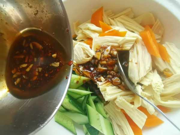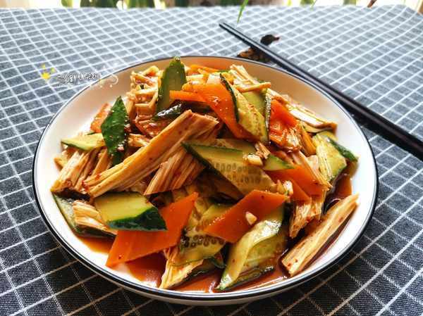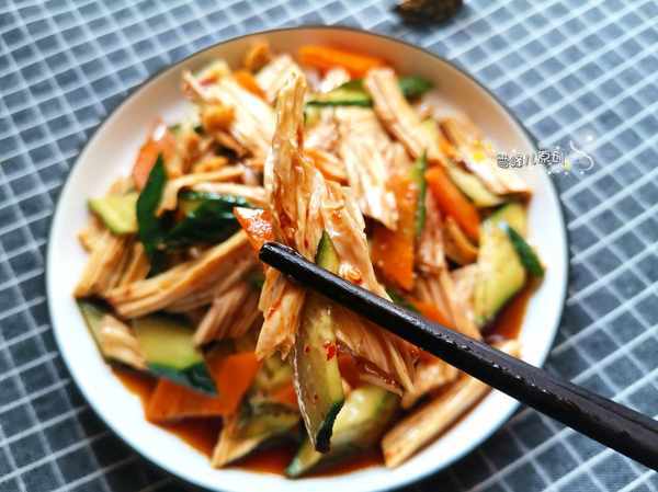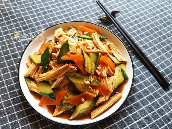 所用資料:腐竹3根,黃瓜半根,胡蘿蔔半根,辣椒粉少許,蚝油,生抽,鹽,醋,花生油1勺。