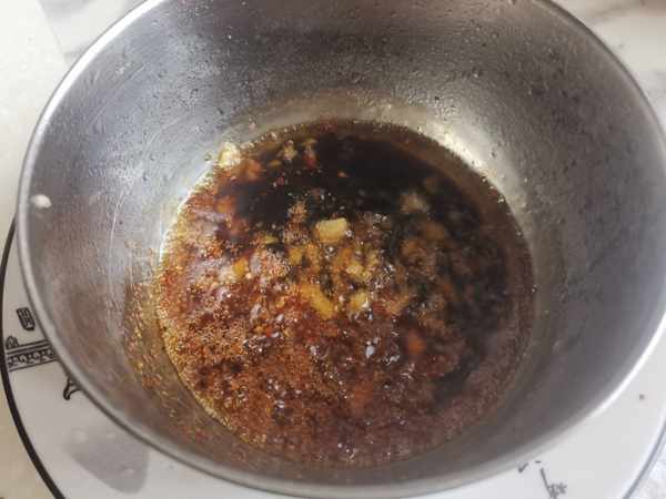 第五步:把容器中放入辣椒粉,蚝油,生抽,鹽,醋,蒜末用熱油烹一下,攪拌均勻,這個就是料汁。