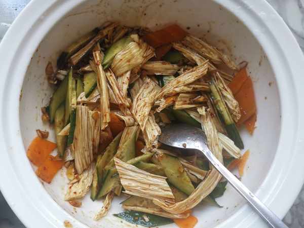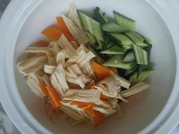 第六步:把腐竹和胡蘿蔔撈出以及黃瓜片,一起放到大碗中。