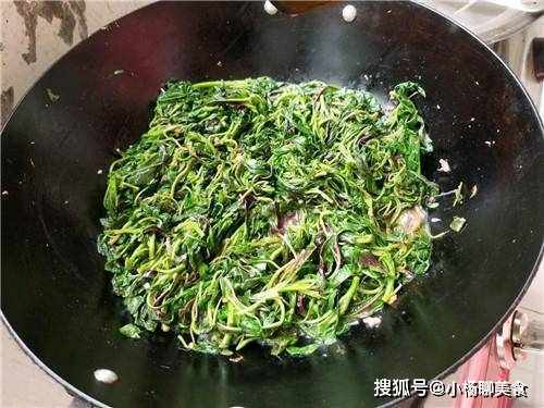 步驟3:在鍋中燒上適量的油,然後將剛才切好的蒜泥倒入鍋中,炒到有香味,並且有一點點微黃後就可以倒入紅莧菜,接著繼續炒,將紅莧菜炒焉,並且斷生後就可以加上鹽,最後完全炒熟後就可以關上火出鍋了。