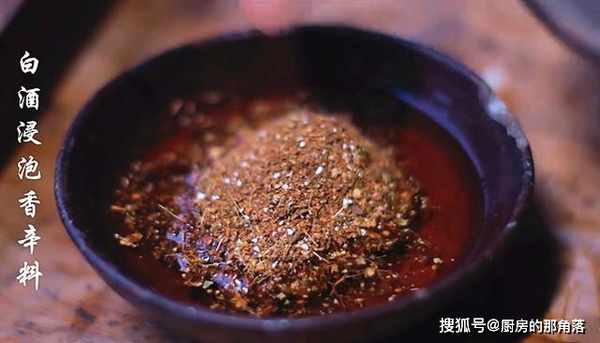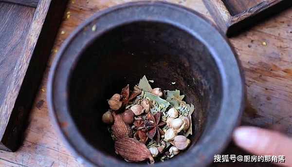 再準備香料,小茴香、桂皮、八角、丁香、香葉、草果、豆蔻。放在蒜臼裏,搗成碎末後,用白酒泡上。