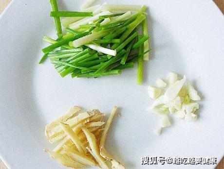 第三步,香葱1根,摘洗乾淨後,切成段,生薑切成絲,大蒜剝皮後切成細細的末,準備好所有食材後即可開始炒菜,在炒鍋中添上適量的食用油,將其燒熱後,放入蒜末和薑絲;