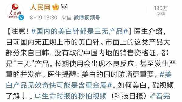 近日,一項話題沖上了微博熱門。據醫生介紹,市面上流通的美白針都是"三無產品"。長期使用會出現不良反應、乃至出現嚴重的併發症。