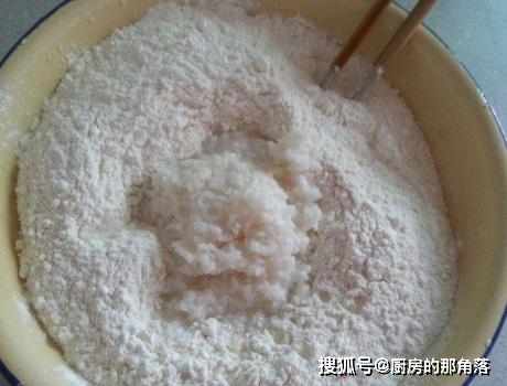 第一步,麵粉準備出適量,將其放入和面盆中,同時在其中加上適量的醪糟(也就是酒釀),在量販店買或者是自己做的都可以,先將麵粉和醪糟混合在一起,混合均勻後;