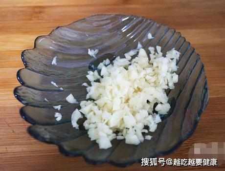 第三步,茄子蒸熟了,下麵即可來調一碗料汁,凉拌菜最重要的便是料汁的調配,5瓣大蒜,放在案板上,用刀背拍一下,然後將蒜皮剝掉,切成細細的蒜末;