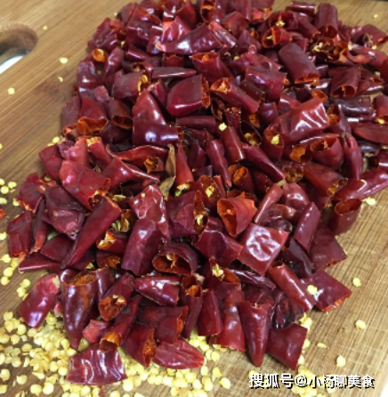 2、先將幹辣椒用水泡過之後再切成小段兒,然後大蒜扒皮之後切成末,準備一些花椒留著備用。