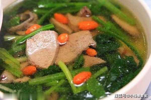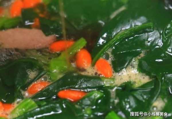 4、將菠菜先焯水,然後再次下鍋煮,下入猪肝一起煮,加薑絲、枸杞煮一分鐘。最後加點香油和鹽攪拌均勻,關火出鍋即可。
