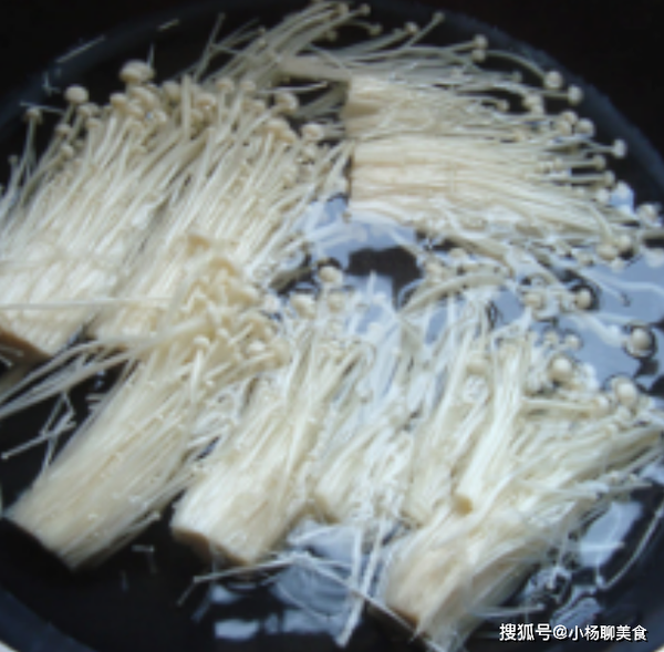 第二步,起鍋燒水,待水沸時放入我們已經準備好的金針菇進行焯水,大概一分鐘,隨後出鍋備用,此時需要過一遍冷水,這樣金針菇吃起來才能够又香又脆。