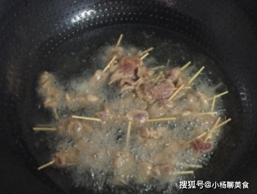 這個時候呢,鍋中可以放油了,油要稍微多一點,因為我這個菜是炸出來的。油溫在六成熱的時候,我們把我們穿好的牙籤肉就放入鍋中進行炸,大概炸至微微變色以後,我們就把它撈出。