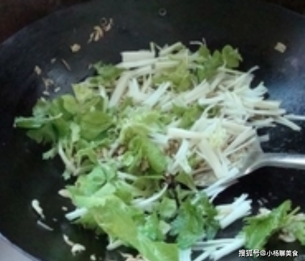 第三步,起鍋,待鍋熱時,放入適量的油,手放在油的上方,感覺有明顯的熱氣上升時,放入葱薑蒜進行爆香,聞到香味的時候,放入我們已經焯水過的食材,翻炒均勻,最後加入我們已經泡發好的粉絲翻炒均勻,隨後加入適量的鹽、醬油、雞精翻炒均勻。