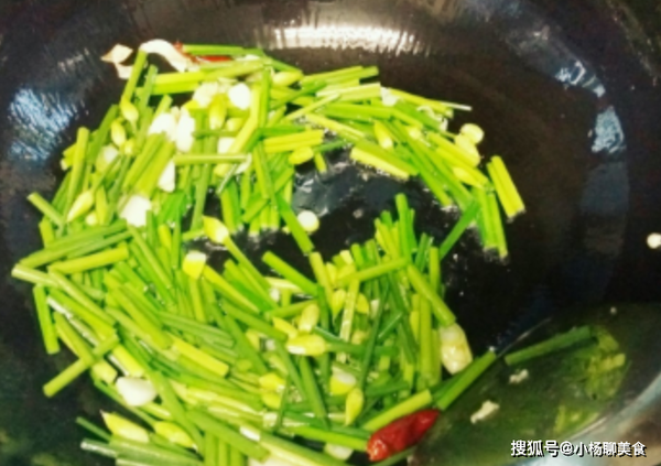 第三步:加入適量的水,把韭苔放入鍋中進行翻炒等韭苔炒至顏色變成翠綠的時候,加入香乾和牛肉絲繼續翻炒幾分鐘之後加入雞精來調味出鍋前加入少許的食用鹽攪拌均勻。