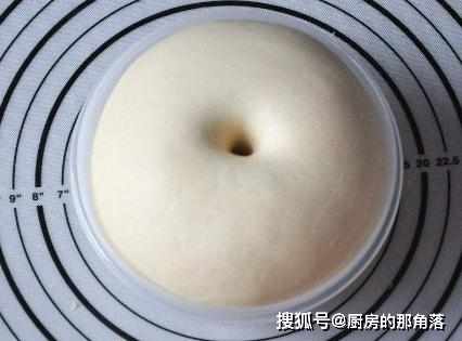 第四步:揉好的麵團放到碗裏,蓋上保鮮膜,室溫25°左右的環境下,進行第一次發酵。發酵到兩倍大的時候,並且用手搓個小洞,都不回彈也不塌陷的時候,就是發好了。